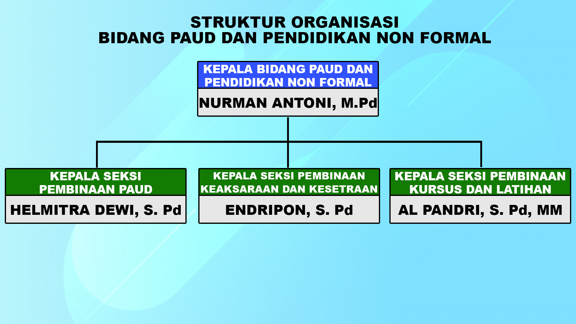 - Kepala Bidang PAUD dan Pendidikan Nonformal mempunyai tugas melaksanakan penyiapan perumusan, pelaksanaan, evaluasi dan pelaporan kebijakan teknis di Bidang PAUD dan pendidikan Nonformal