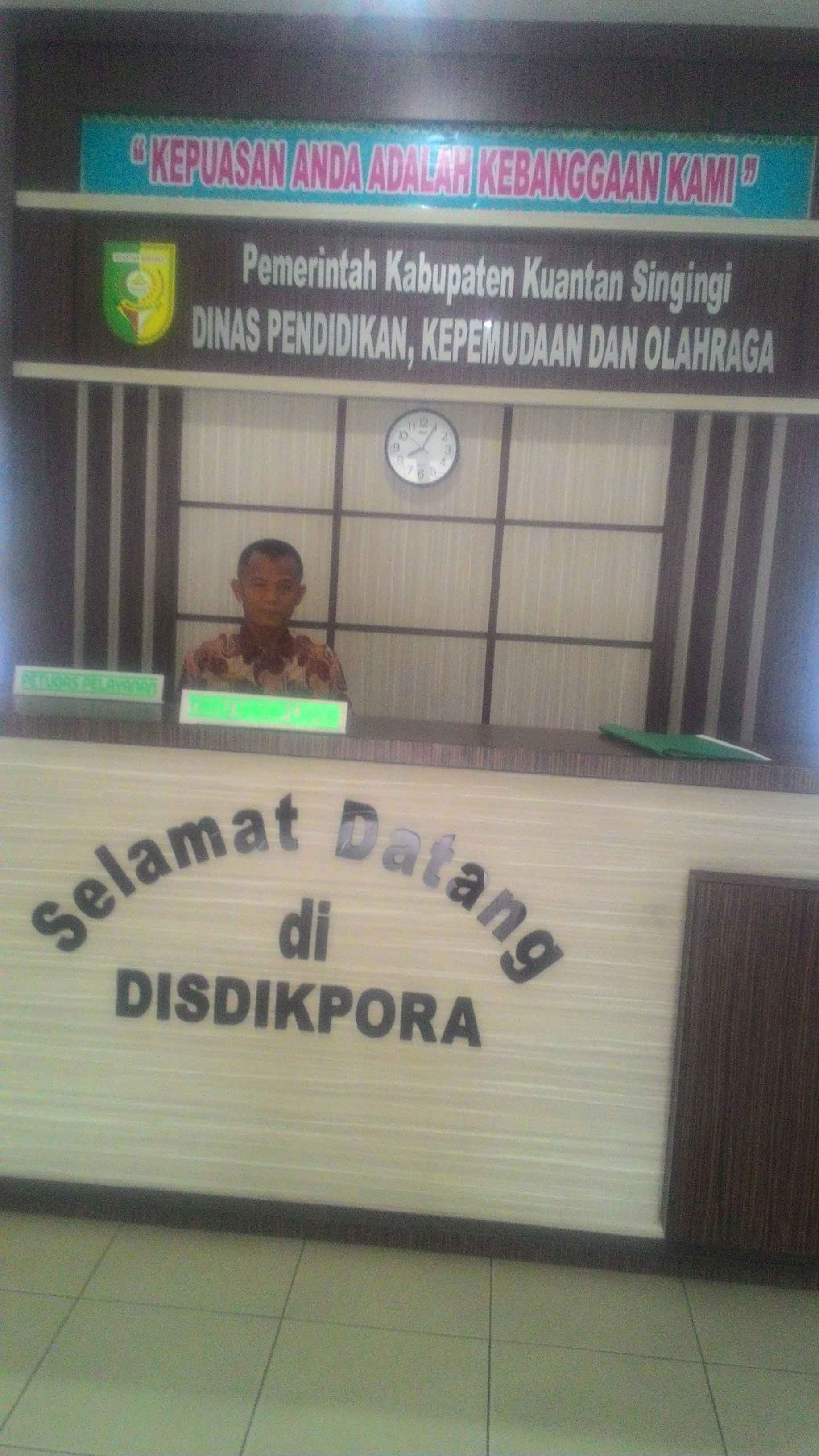 Dalam rangka mewujudkan motto pelayanan "Kepuasan Anda adalah Kebanggaan Kami", Petugas Pelayanan Dinas Pendidikan Kepemudaan dan Olahraga Kabupaten Kuantan Singingi selalu siap dan profesional untuk melaksanakan tugas pelayanan bagi sekolah, guru dan masyarakat umum yang membutuhkan.